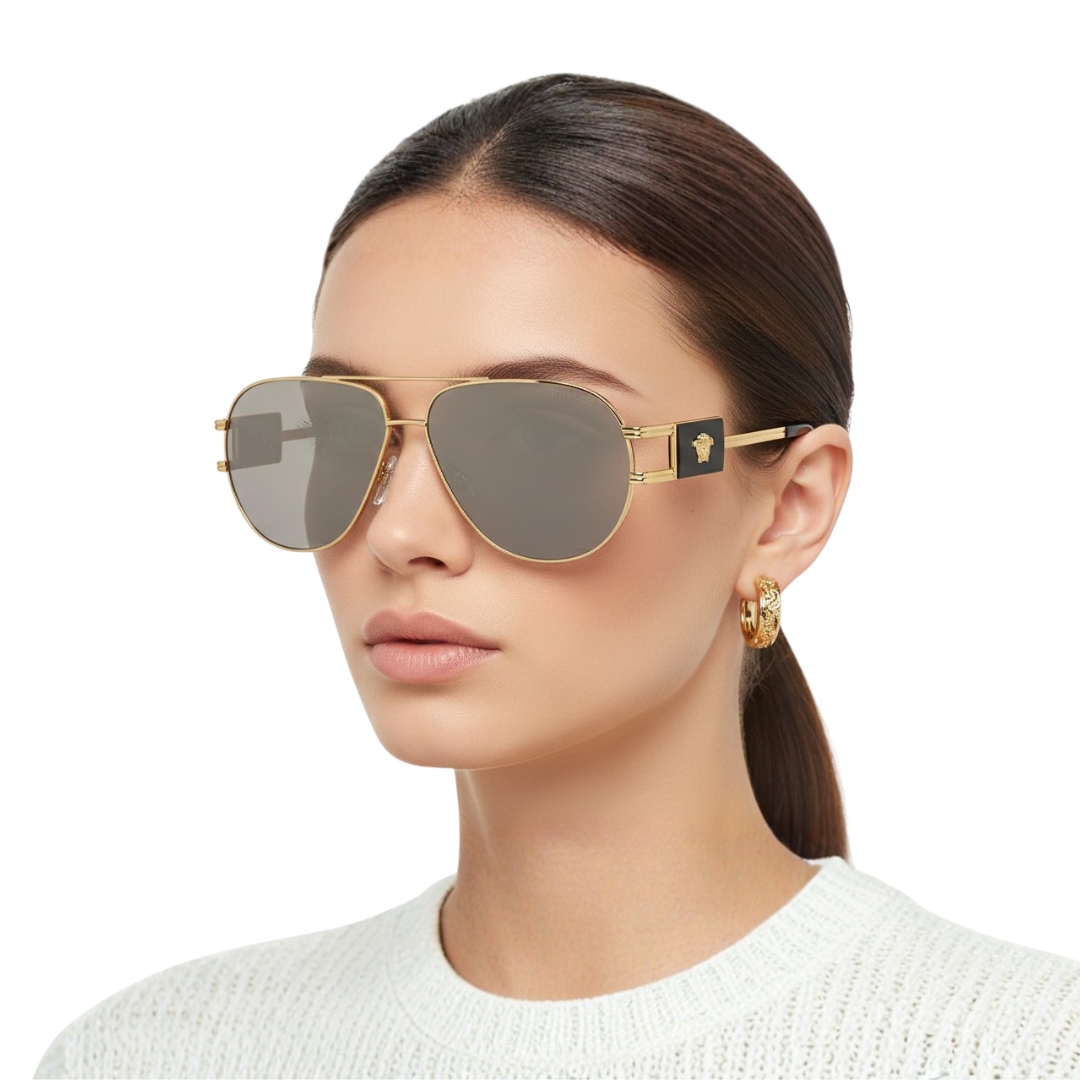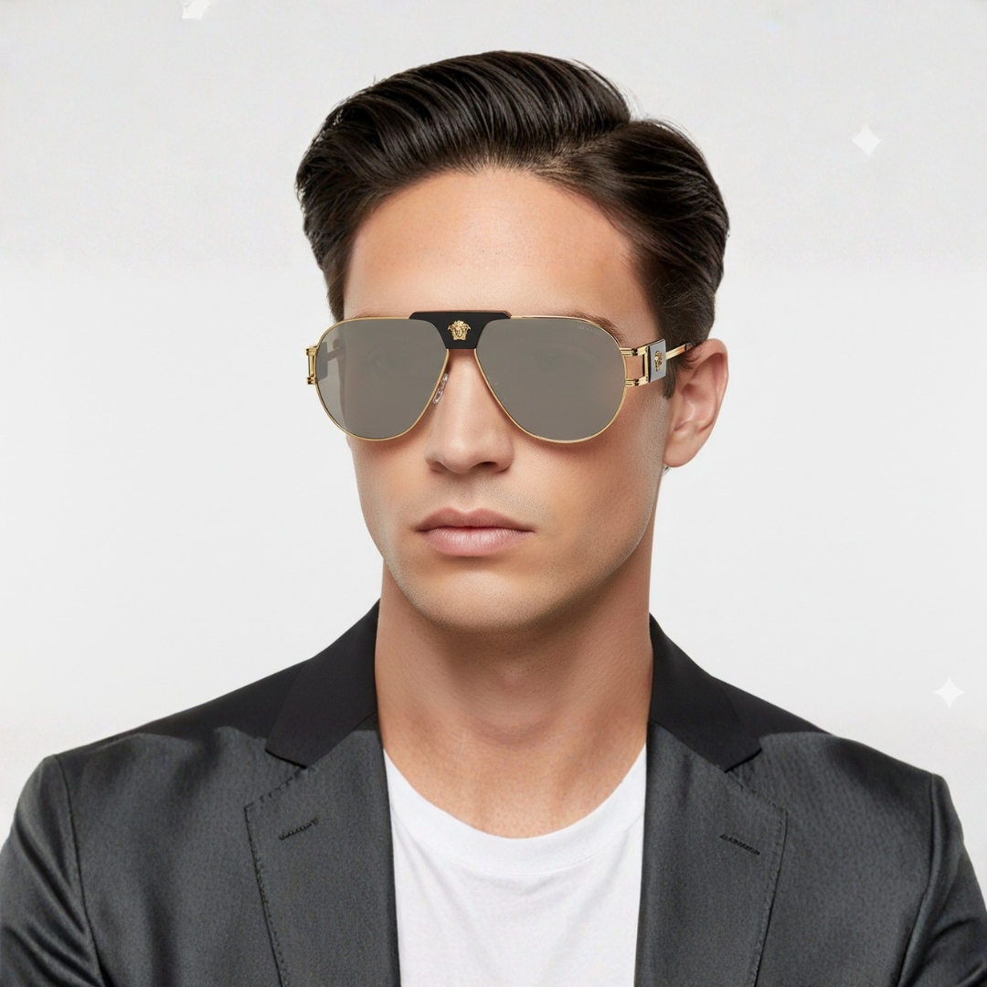 - Style iconique : la silhouette aviateur, universellement flatteuse, associée au prestige de la griffe Versace.